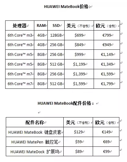 售價方面,華為MateBook擁有M3\M5\M7三個處理器版本,固態硬盤覆蓋128GB、256GB以及512GB,售價從699美元到1799美元。